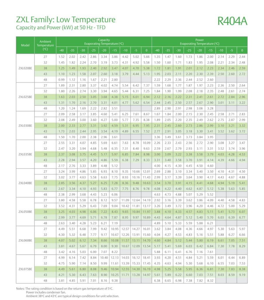 | Model | Công suất | Công suất lạnh (Te = – 25℃ , DT = 7K) |